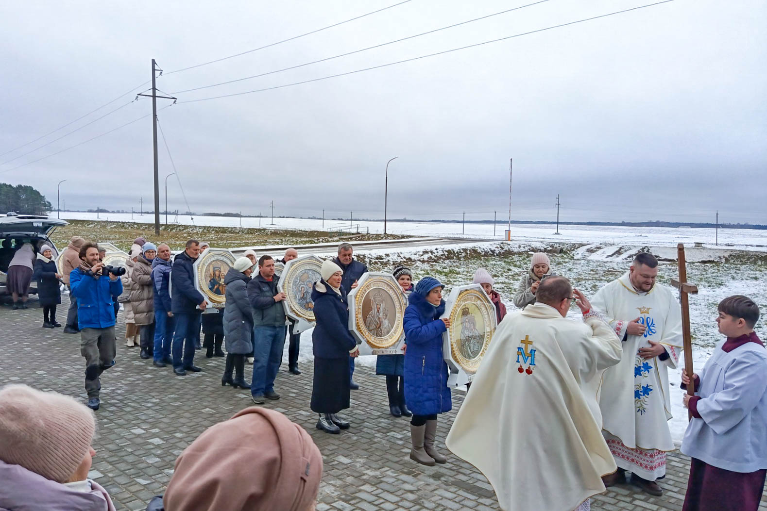— Гэта быў час пандэміі, — расказваў святар. — Спыніліся пілігрымкі вернікаў у вядомыя санктуарыі, людзі былі ў няведанні. І ксёндз-канонік Уладыслаў Завальнюк, на той час пробашч касцёла Святых Сымона і Алены ў Мінску, выступіў ініцыятарам і арганізатарам перэгрынацыі копій цудадзейных абразоў Багародзіцы. Першая пілігрымка адбылася ўздоўж мяжы Беларусі. Тады яе ўдзельнікі маліліся ў трох інтэнцыях: аб спыненні пандэміі, адбудове пасля пажару касцёла ў Будславе і спакоі на тэрыторыі Беларусі і ў сэрцы кожнага яе жыхара. І, як бачым, Марыя выслухала просьбы і зрабіла ўсё, аб чым маліліся. Сёння яна прыйшла да вас. Яна выслухае кожнага і ахіне сваім цудадзейным плашчом. Як нашы дзяды і прадзеды з ружанцам у руках кленчылі перад цудадзейнымі абразамі, так і мы з вамі маем цудоўную магчымасць звярнуцца да Маці Божай.