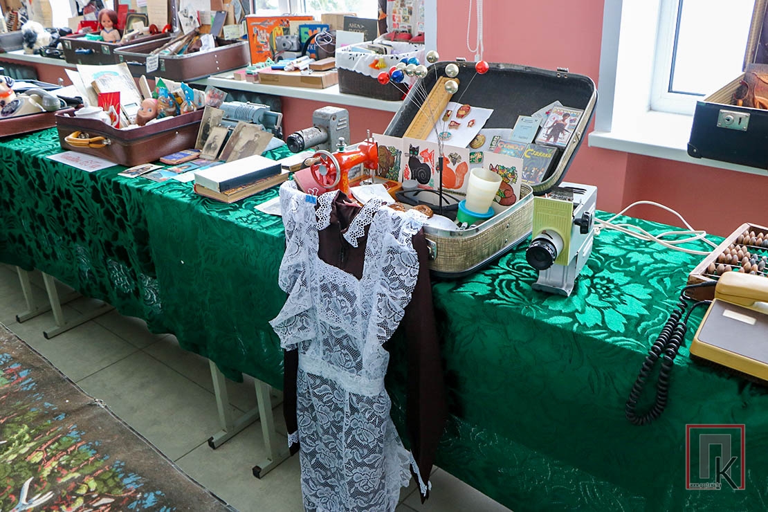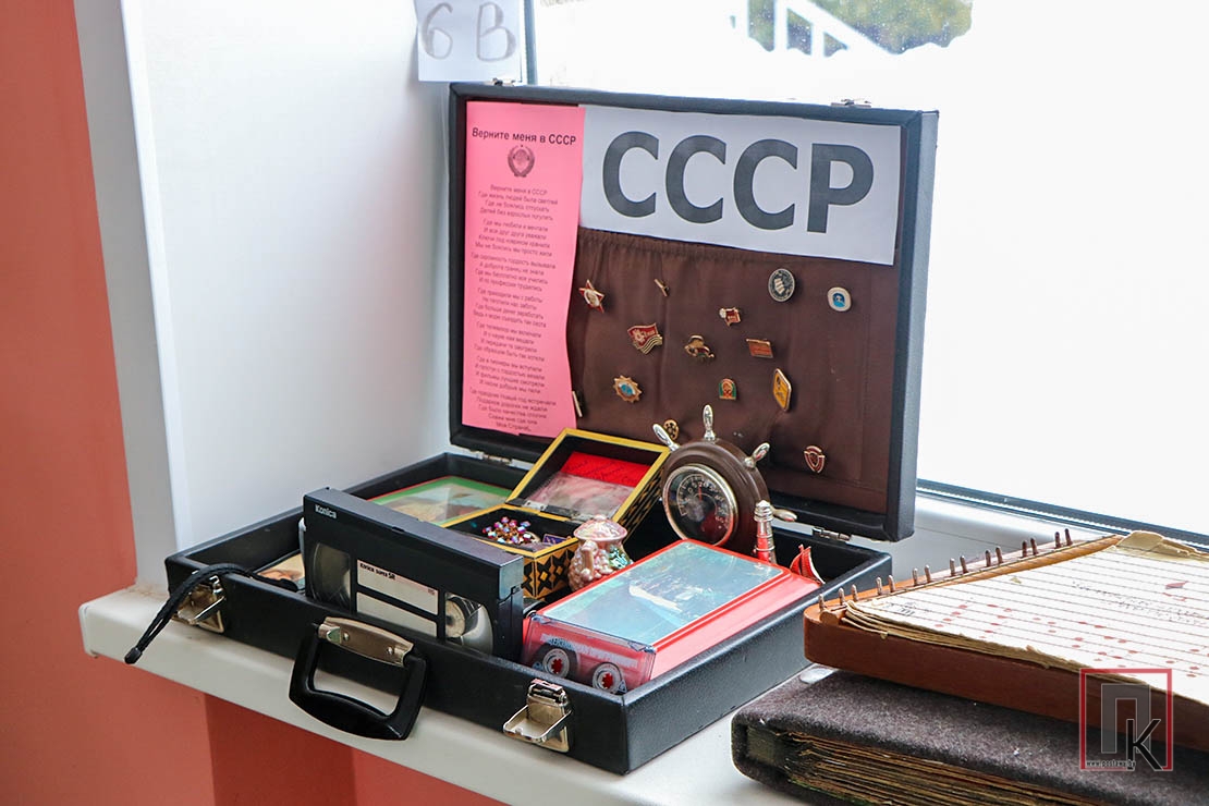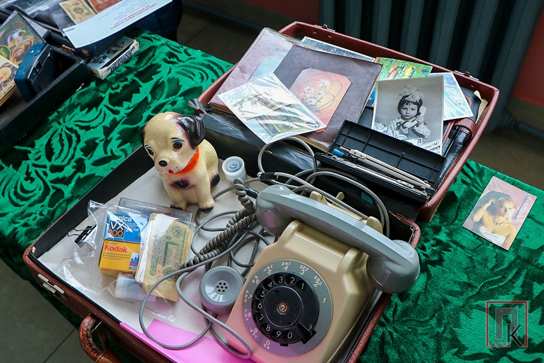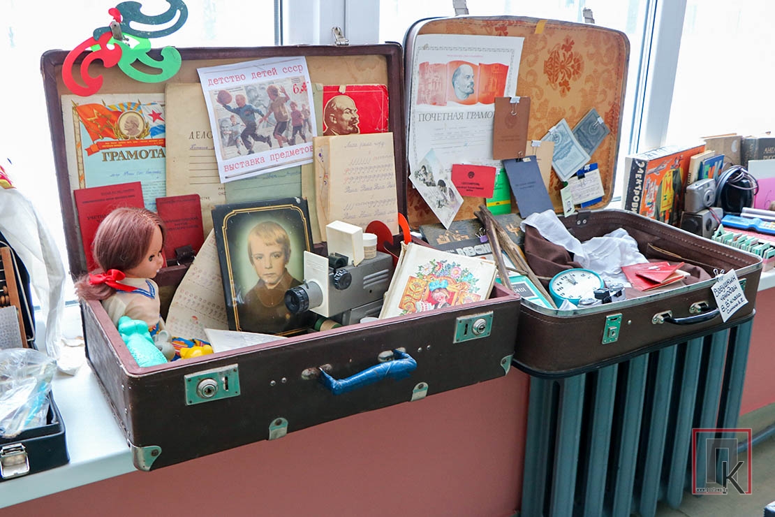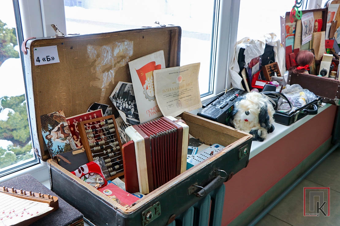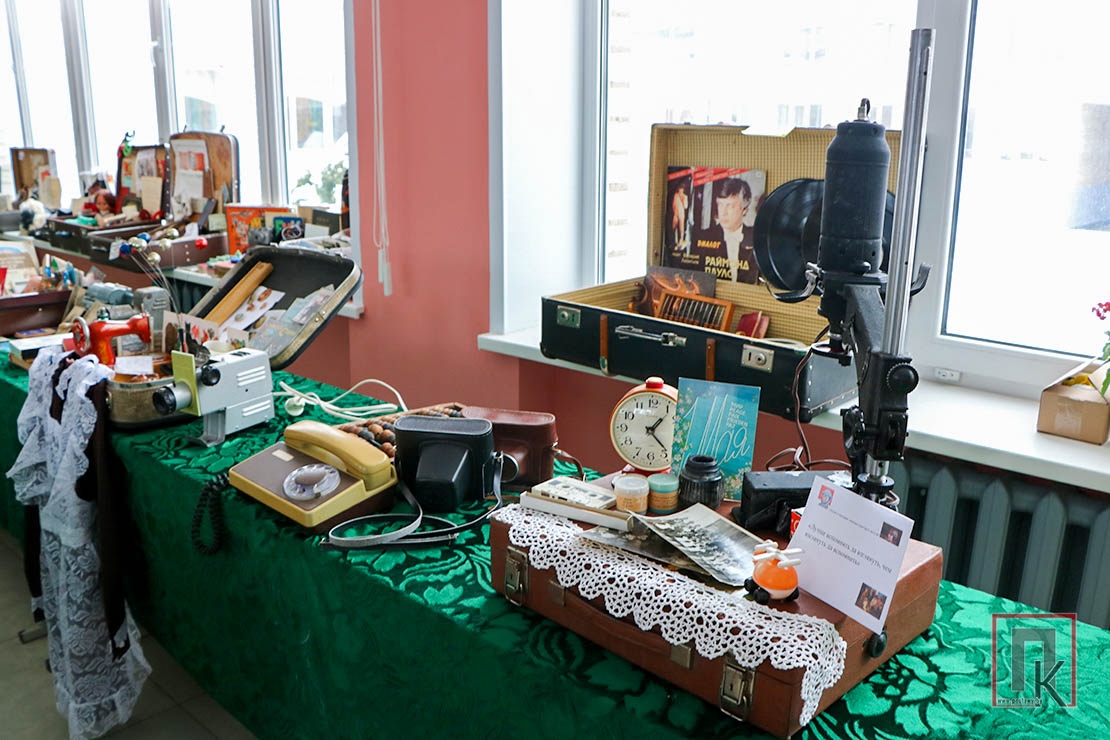В каждом представленном чемодане (а их там было более 20) — настоящие сокровища из прошлого, собранные стараниями учащихся, родителей и педагогов: старый дисковый телефон, кассетный магнитофон, пионерские галстуки, советские учебники и прописи, деревянные счёты и металлические конструкторы…
