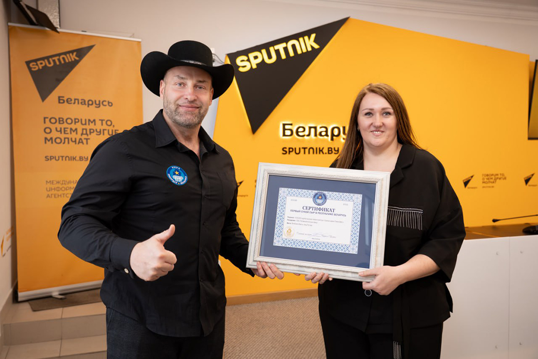 Церемония вручения специальных сертификатов проходила в мультимедийном пресс-центре Sputnik Беларусь. Этот документ из рук главного эксперта Национального реестра Книги рекордов Беларуси Кирилла Шимко получила инженер-технолог Поставского молочного завода Алёна Гутор.