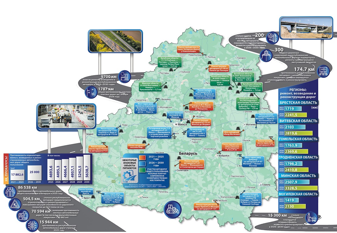 На финансирование мероприятий программы предусмотрены средства в размере Br18,88 млрд. Ее реализация позволит выполнить в 2026-2030 годах ремонт, возведение и реконструкцию не менее 25 тыс. км автомобильных дорог общего пользования (или 140% к ожидаемому выполнению за текущую пятилетку) и обеспечить переход к новому качеству автомобильных дорог, отвечающих современным стандартам безопасности.