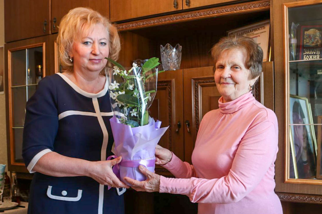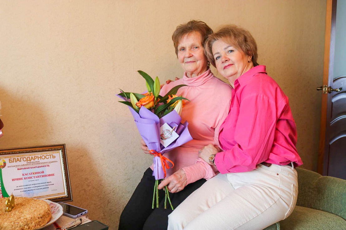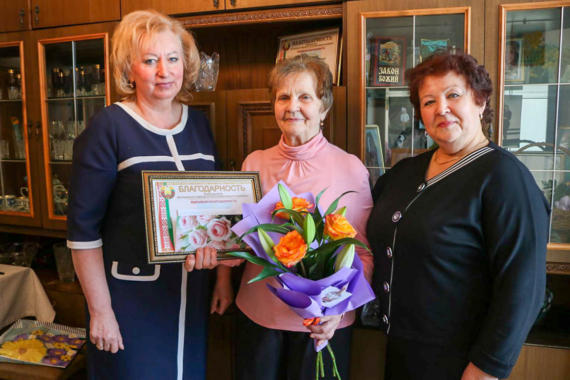 Ірына Канстанцінаўна ўжо шмат гадоў на пенсіі, але яе і сёння з удзячнасцю ўспамінаюць у калектывах, дзе працавала. Пра гэта гаварылі, віншуючы імянінніцу і ўручаючы ёй Падзяку старшыні райвыканкама і падарункі, старшыня раённага савета ветэранаў Ганна Літвіновіч і начальнік Пастаўскага аддзела Віцебскага абласнога ўпраўлення ФСАН Іна Саковіч. А з аддзела культуры райвыканкама юбілярцы перадалі шыкоўны букет.