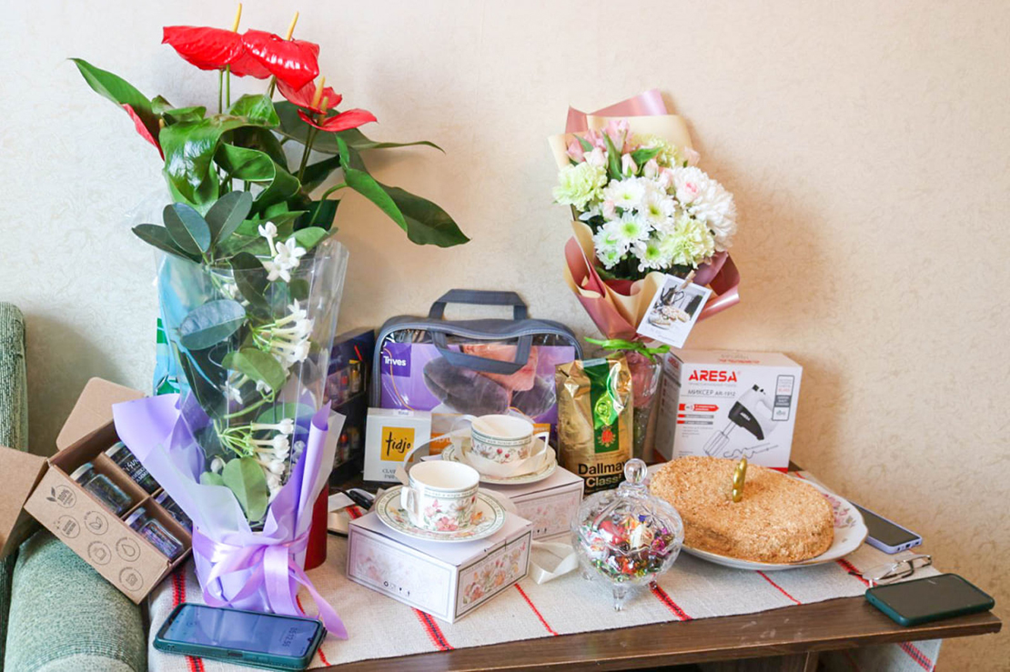 Першымі ж па відэасувязі павіншавалі бабулю з юбілеем унучкі Каця і Юля, якія з сем’ямі жывуць за мяжой. Кветкі і падарункі ад іх даставіў кур’ер. А вось кватэра дачкі Алены — у тым жа мікрараёне па вуліцы Касманаўтаў у райцэнтры, дзе і маці. Алена загадвае псіханеўралагічным аддзяленнем АДРАЦ «Ветразь». Яна частая госця ў мамы, у іх шмат агульных клопатаў.
