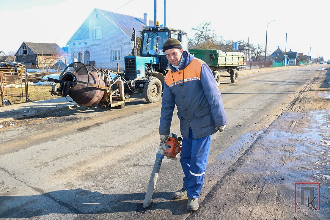 На городских улицах в эти дни работают Пётр Королёнок, Николай Карасик, Сергей Коптюхов и механизатор Александр Козловский на тракторе с рециклером асфальтобетона ЕМ-350. Уже «подлатали» улицы П. Морозова, Пролетарскую, Коммунальную. В связи с ремонтом моста по улице Красноармейской движение на них интенсивное. Частично прошлись с рециклером по 17 Сентября, Ворошилова, Гагарина, Кляро. Израсходовали 7 тонн СОМС.