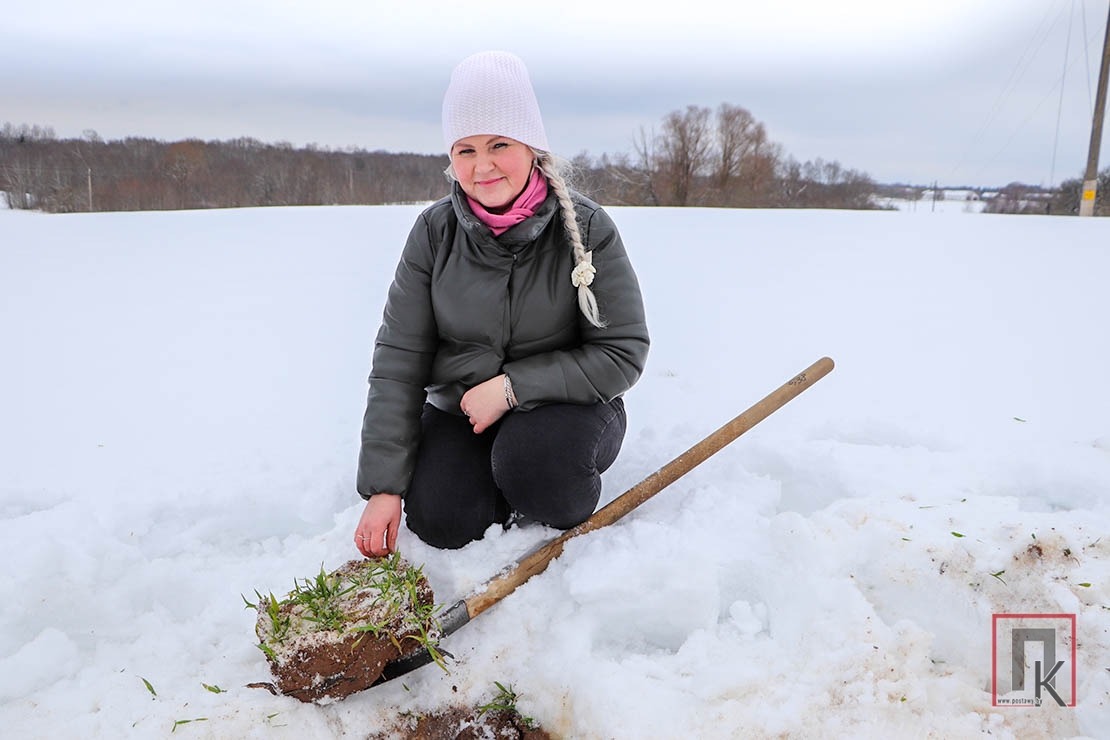 Спыняемся ля поля, дзе пасеяны азімы ячмень. Па глыбокім снезе прабіраемся да патрэбнага ўчастка. Аксана лапатай разграбае снег і акуратна, каб не пашкодзіць раслінкі, выкопвае кавалак у два сумежныя радкі шырынёй каля 30 сантыметраў і глыбінёй — каля 20. Звяртаю ўвагу на тое, што раслінкі насычанага зялёнага колеру. Аднак, як кажа спецыяліст, гэта яшчэ не гарантуе іх жыццядзейнасці. Як і пажоўклыя расліны не заўсёды азначаюць гібель пасеваў. Рашаючае значэнне мае стан карнявой сістэмы і вузла кушчэння.