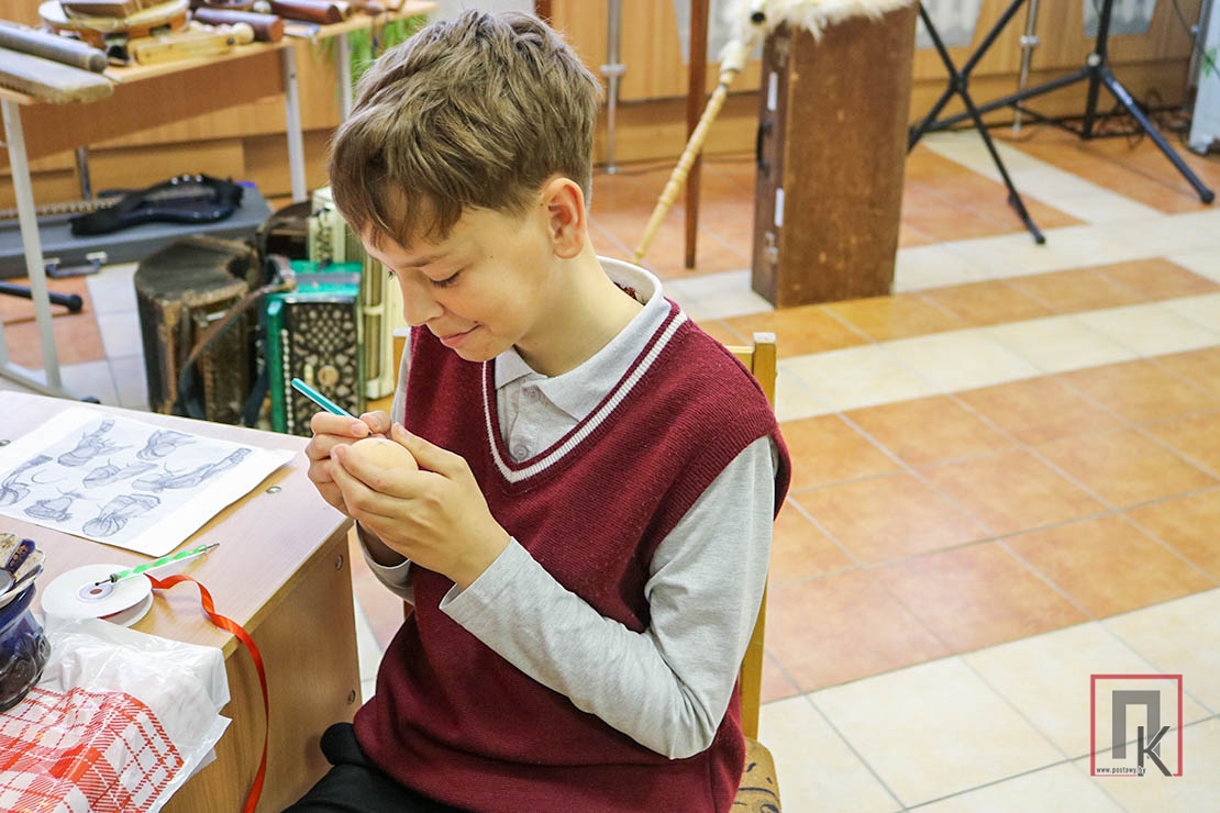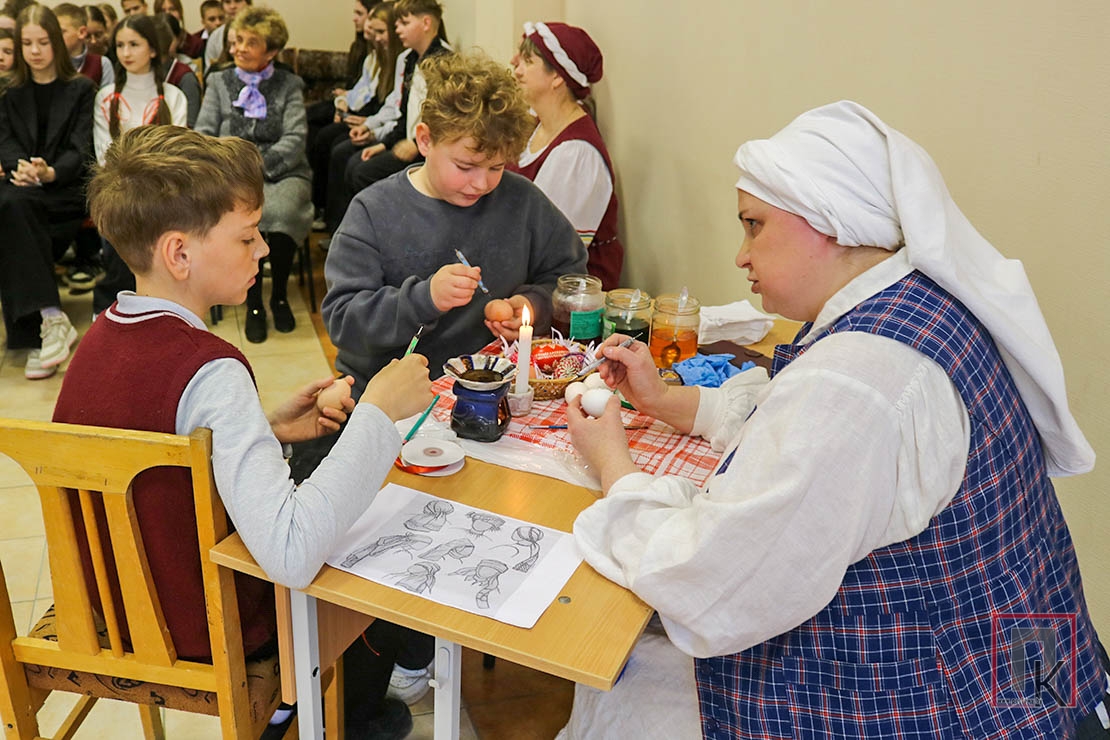 Таццяна Петух расказала пра жаночыя галаўныя ўборы, якія насілі нашы продкі, прадэманстравала, як іх завязваць. А потым запрасіла ахвотных распісваць яйкі пасхальнымі ўзорамі.